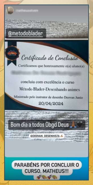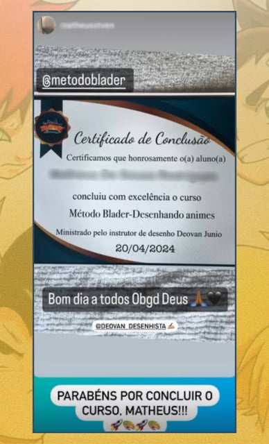 Deovan Junio é um verdadeiro mestre dos desenhos, e será seu professor nesta jornada. Apaixonado por animes, ele é especialista no estilo mangá e em desenho realista, tendo aprimorado suas técnicas ao estudar pintura realista com lápis de cor. Formado em Design Gráfico, Deovan ministra aulas particulares, compartilhando seu conhecimento com iniciantes e com aqueles que buscam se aperfeiçoar no mundo dos desenhos!